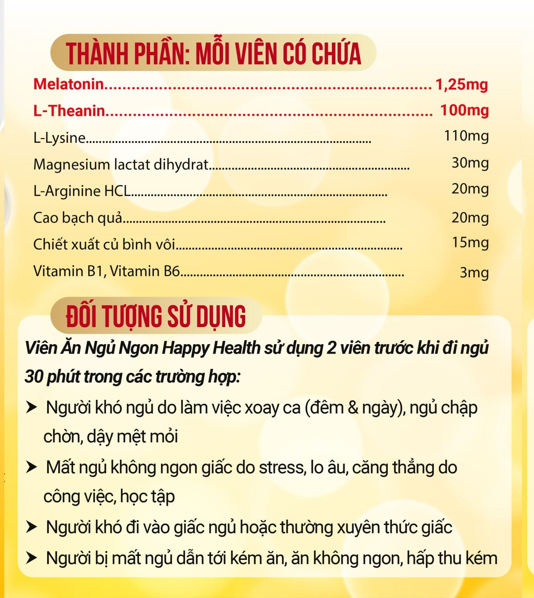 Viên Mex Ăn Ngủ Ngon Happy Health giúp ăn ngon ngủ ngon nhờ các thành phần dưỡng chất tự nhiên rất tốt và an toàn cho cơ thể người sử dụng:
